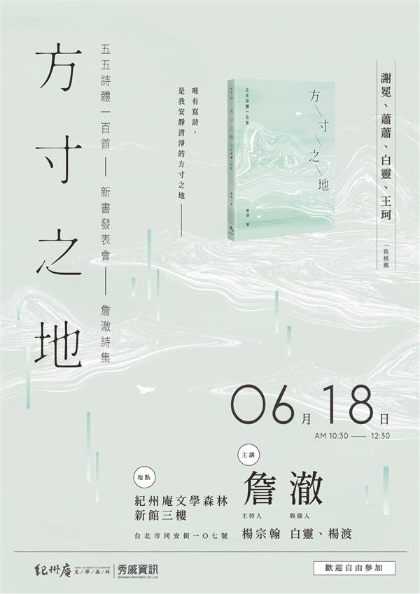 新書分享會將於6/18(日)在紀州庵文學森林的新館三樓舉辦,由詹澈老師本人主講之外,也有台灣知名作家楊宗翰老師擔任主持要角,更邀請白靈老師和楊渡老師參與對談,定能和各位讀者碰撞出文學創作的絢爛火花!...